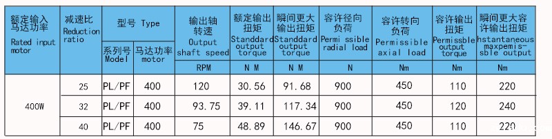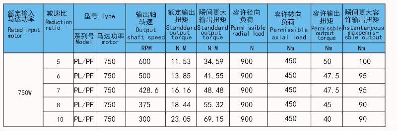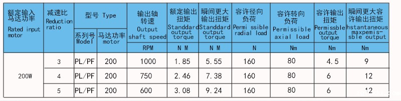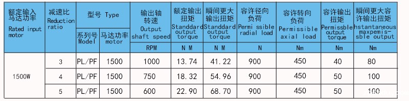 行星减速机性能表 PERFORMANCE(输入转速为3000rpm时)