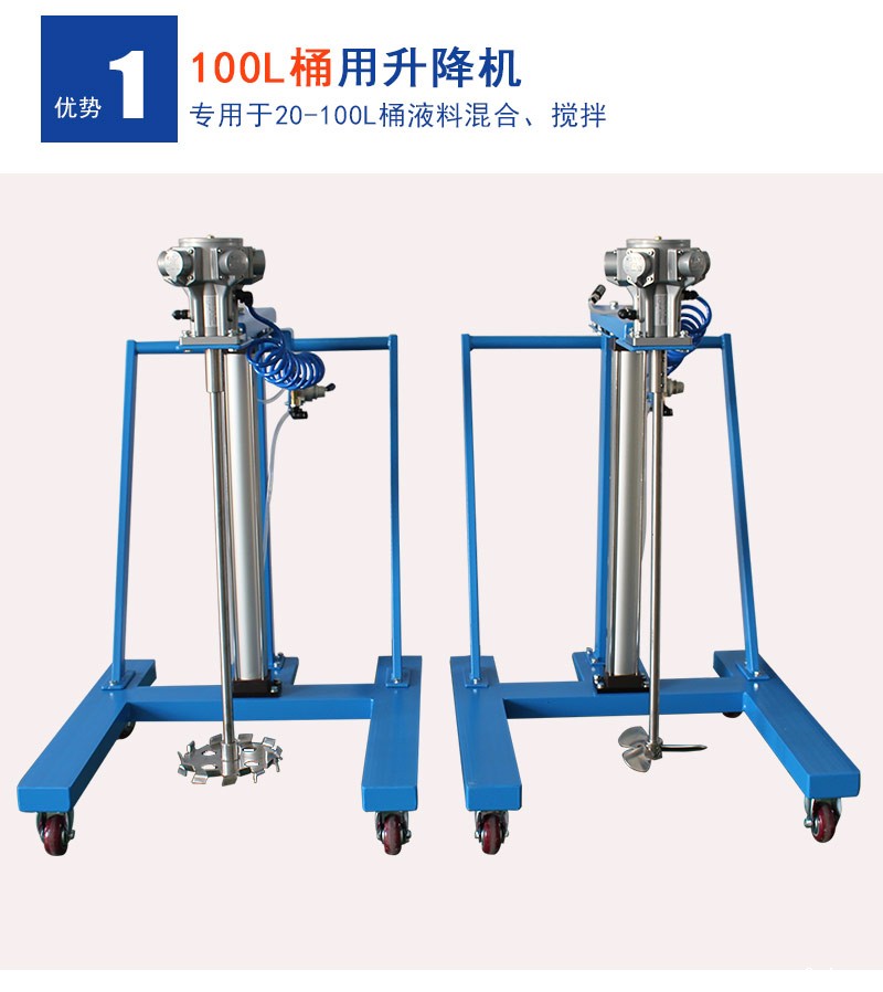 1)搅拌容量:适合于20L-100L开口桶,气动升降方式。