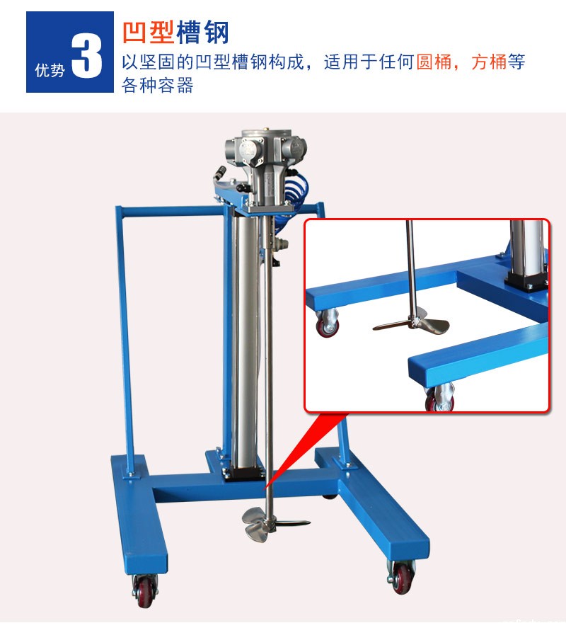 U型气动升降式搅拌机产品特点:本机以气缸自动升降控制,底座U型框结构设计,尾部轴承硬棒导向,搅拌时平稳牢固,料桶进出方便,适用于圆桶、方桶。同时有固定式和移动式可选择。